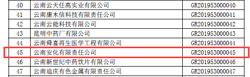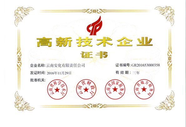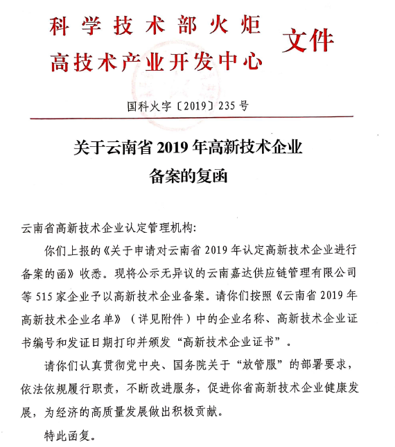 根據(jù)全國高新技術企業(yè)認定管理工作領導小組辦公室《關于云南省2019年高新技術企業(yè)備案的復函》(國科火字﹝2019﹞235號),公司再次獲得“高新技術企業(yè)”稱號。