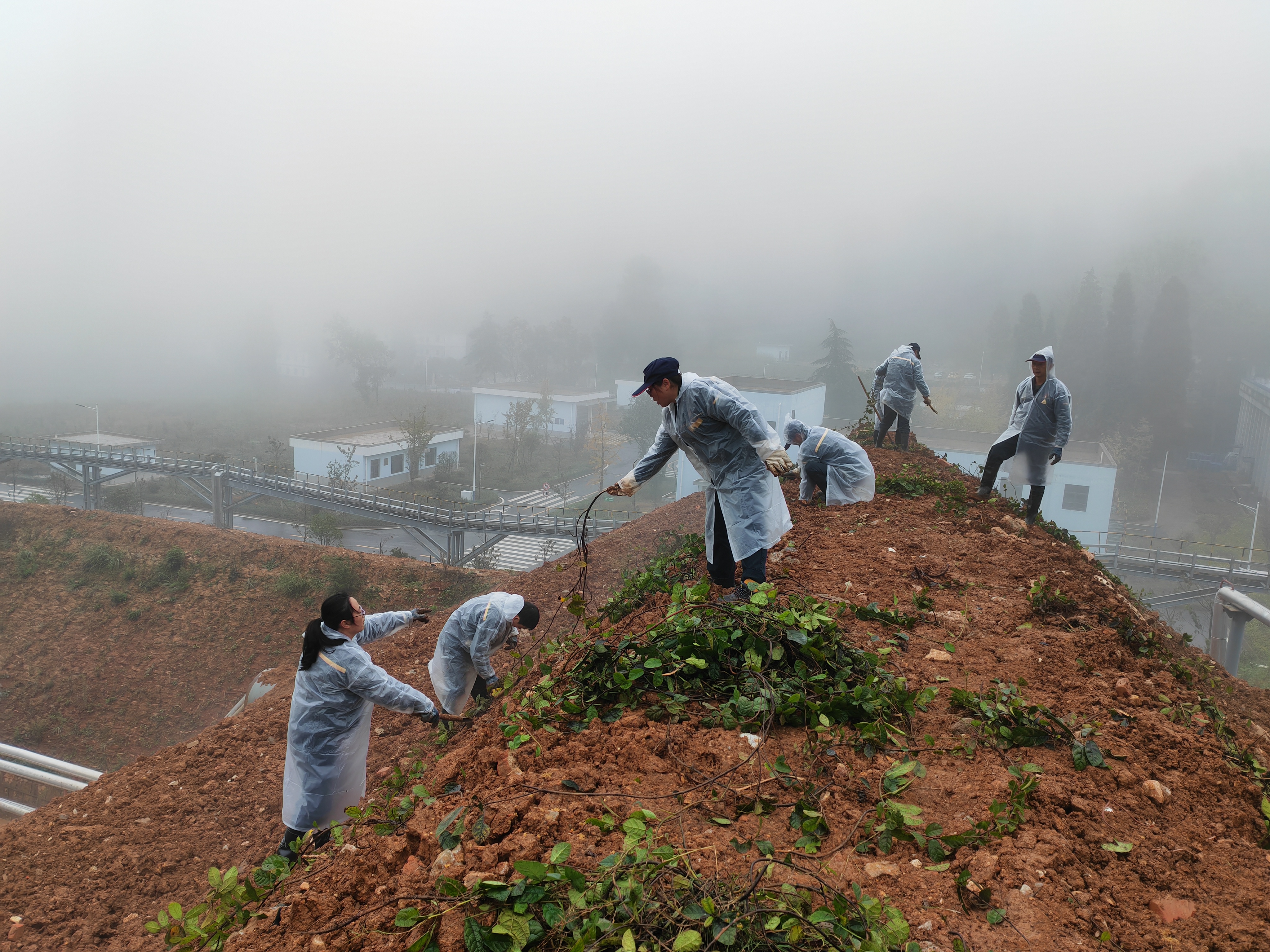 活動當天是二十四節(jié)氣中的“霜降”,大凹塘氣溫再降,陰雨綿綿,黨員同志們積極響應黨支部號召,如約而至。經(jīng)過簡單分工,有的黨員負責到老生產(chǎn)線挖地石榴藤,并搬運藤到新生產(chǎn)線,有的手持鐮刀挖坑栽種,大家分工協(xié)作、現(xiàn)場一片熱火朝天的景象?;顒又写蠹业男雍脱澩日礉M泥土,臉上分不清是雨水還是汗珠,但依然擋不住大家對植綠護堤的熱情,各個精神飽滿、干勁十足,充分發(fā)揮黨員的模范帶頭作用。經(jīng)過同志們一個上午的共同努力,光禿禿的土堤上點綴上了點點綠色。