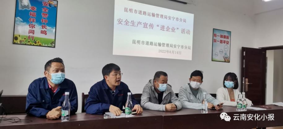 按照國(guó)務(wù)院安委會(huì)、應(yīng)急管理部、交通運(yùn)輸部安全生產(chǎn)宣傳“五進(jìn)”要求,結(jié)合“遵守安全生產(chǎn)法 當(dāng)好第一責(zé)任人”的“安全生產(chǎn)月”主題,6月14日,昆明市道路運(yùn)輸管理局安寧市分局到中達(dá)物流開展了安全生產(chǎn)宣傳“進(jìn)企業(yè)”活動(dòng) 。