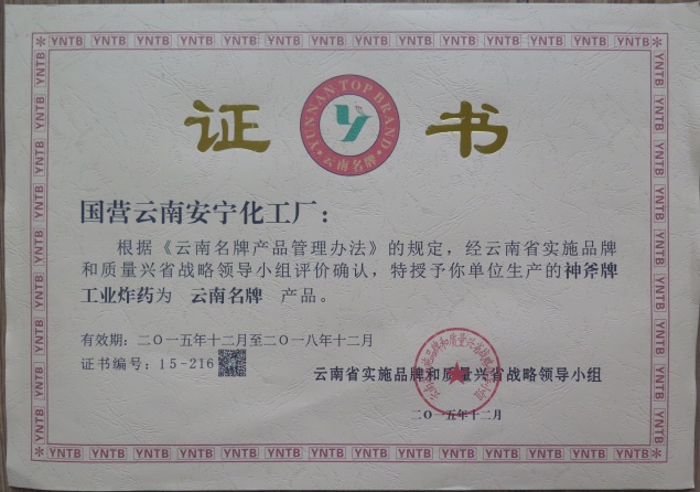 2015年12月,經(jīng)云南省實施品牌和質(zhì)量興省戰(zhàn)略領導小組評價確認,我廠的“神斧牌”工業(yè)炸藥被繼續(xù)授予為云南名牌產(chǎn)品。2016年9月6日,我廠應邀出席安寧市人民政府召開的2016年質(zhì)量強市工作推進會,會上,市政府領導對2015年獲得云南名牌產(chǎn)品企業(yè)進行了表彰,同時頒發(fā)了證書和牌匾。